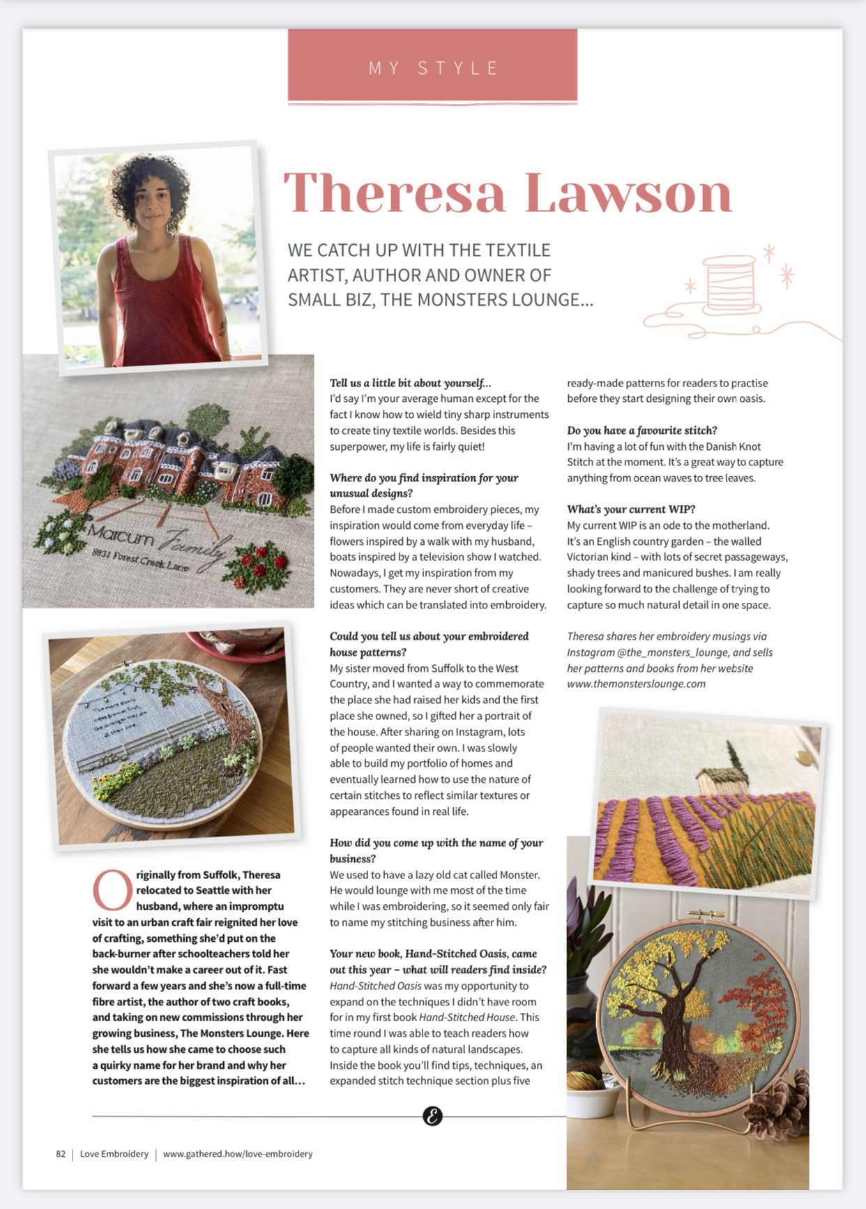The Monsters Lounge is the name under which textile artist Theresa Lawson creates embroidered and fiber art.